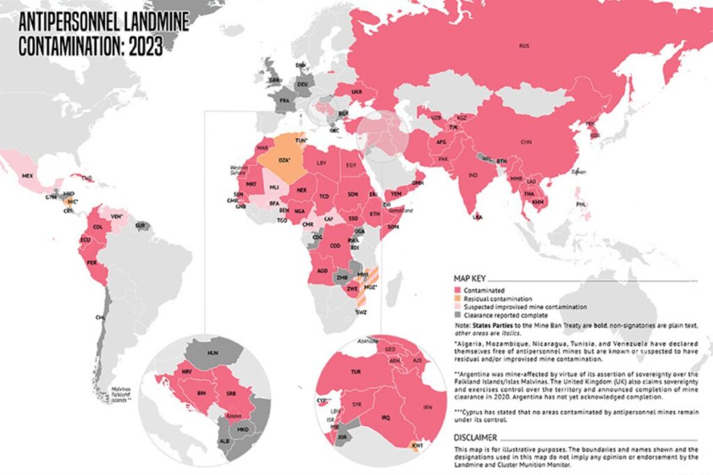 Selon le Landmine Monitor, au moins 58 États et autres zones sont contaminés par des mines antipersonnel.