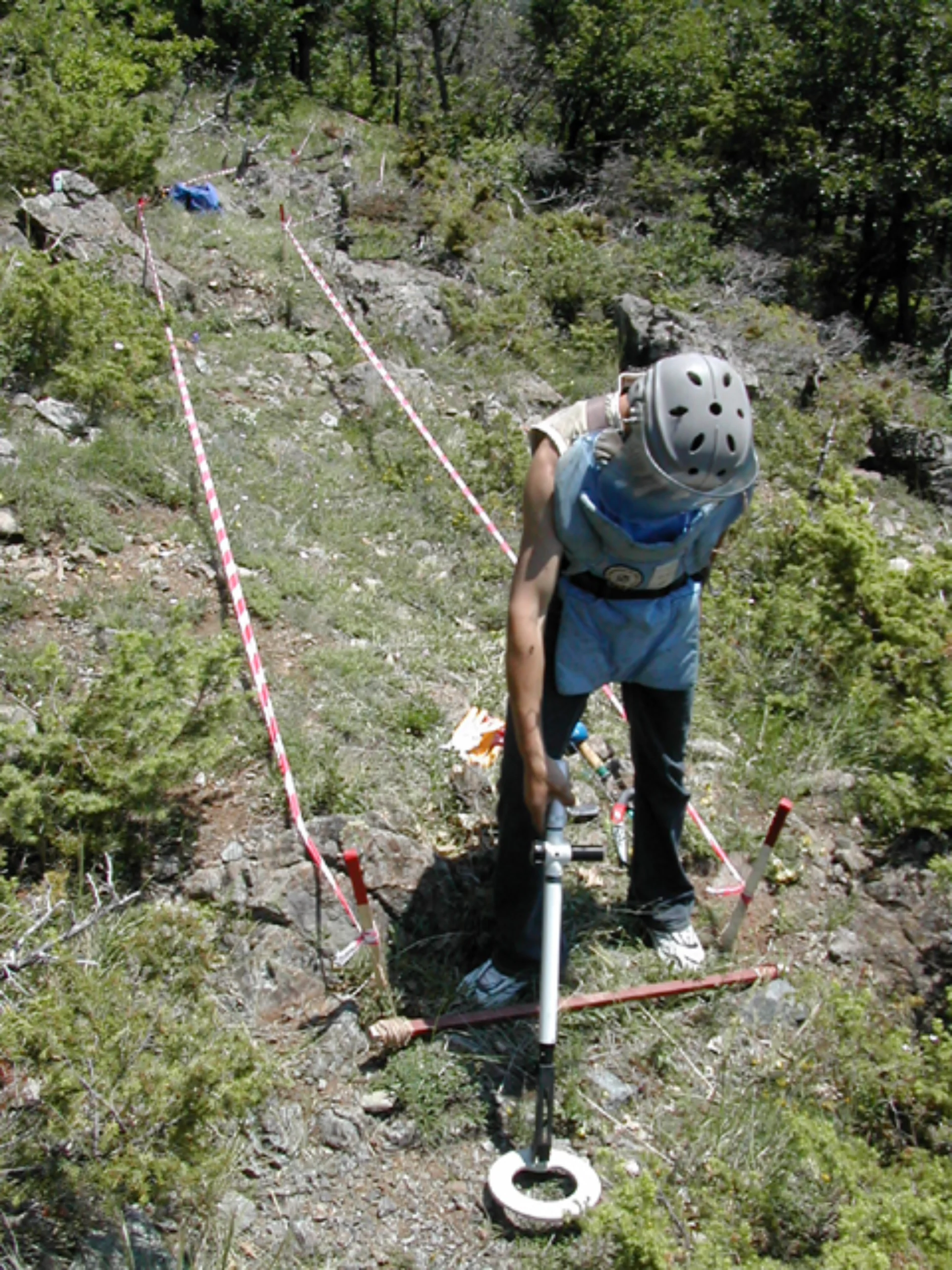 Une machine de préparation du sol et un véhicule blindé ont complété les opérations manuelles de déminage, menées principalement dans le nord du pays, dans les provinces de Has et Kukës, jusqu’en 2004.