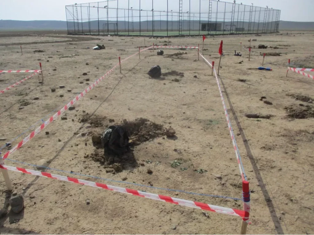 Plusieurs mines improvisées partiellement excavées près du terrain de football du village de Sultan Abdullah (mars 2022)